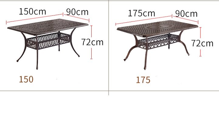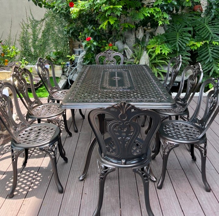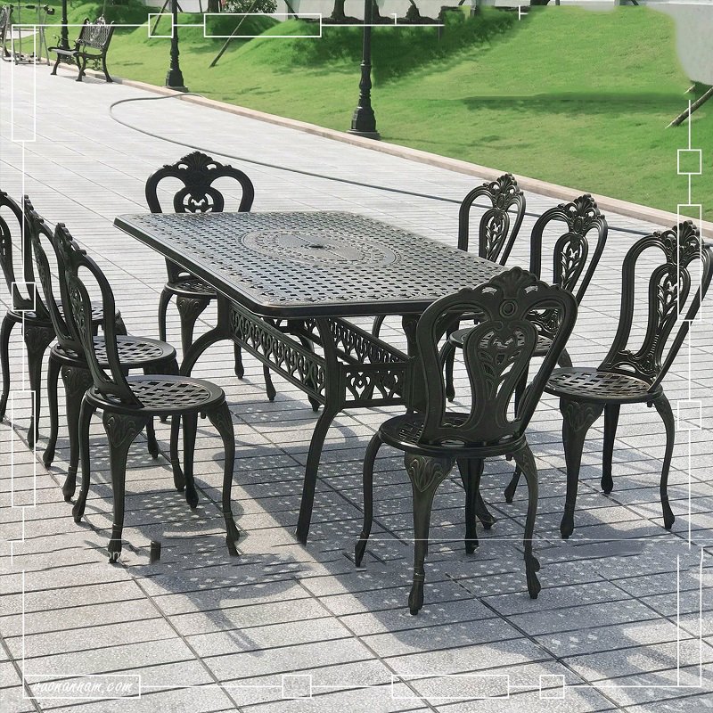 Bộ bàn ghế nhôm đúc ngoài trời gồm một bàn hình chữ nhật có kích thước 150*90*73cm và 6 ghế 45 *52*87cm cả bàn và ghế ngồi đều được thết kế mặt lỗ và các họa tiết hoa văn rất cân xứng và mềm mại để tạo nên một vẻ đẹp duyên dáng và nét sang trọng quý phái và thanh lịch… Kiểu dáng thiết kế độc đáo, ấn tượng trong các đường nét tỉ mỉ chi tiết giúp những mẫu bàn ghế nhôm đúc luôn được thu hút người xem từ cái nhìn đầu tiên, bàn ghế nhôm đúc khác hẳn với các chất liệu thông thường khác như gang sắt có thể bị gỉ, gỗ dễ bị mục. còn nhôm đúc là chất liệu được khắc phục cả hai nhược điểm trên, bàn ghế nhôm đúc có độ cứng cáp và bền bỉ chịu lực tốt không bị mài mòn hay gỉ sét trước thời tiết nhờ lớp sơn tĩnh điện cao cấp cùng với thiết kế chính xác, đã cho chúng ta thấy được khả năng chịu lực bền bỉ trước mọi tác động của thời tiết.