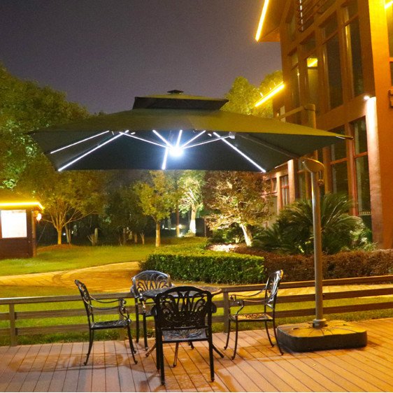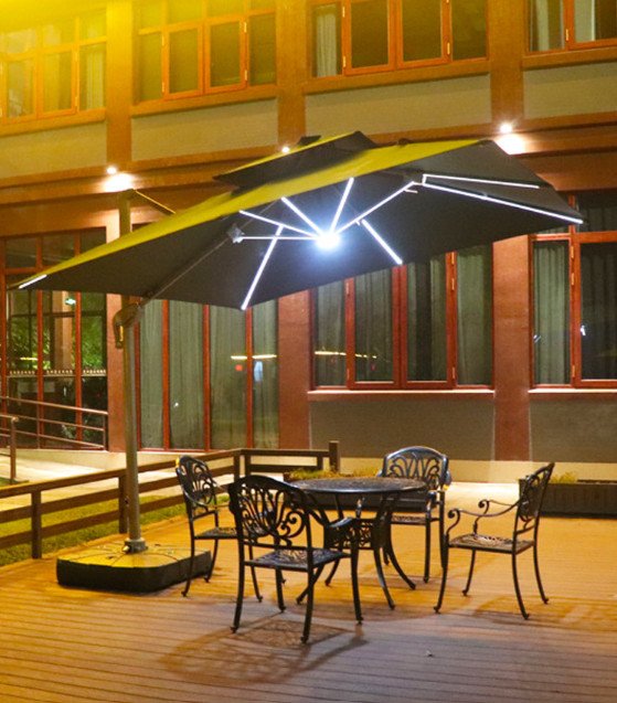 Ô lệch tâm có đèn 3x3m hợp kim có đèn dạng sao đế nhựa đổ nước dùng để trang trí sân vườn bạn có thể xoay và điều chỉnh mọi hướng, nấc xoay 360 độ giúp bạn dễ dàng điều chính theo hướng nắng một cách thoải mãi và mang đến khả năng che nắng hoàn hỏa nhất, bạn có thể điều chỉnh ô nghiêng theo ý muốn mà không cân mất thời gian để dịch chuyển cả chân đế của ô.