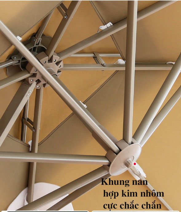 Khung và nan ô làm từ chất liệu hợp kim nhôm cao cấp được phủ thêm một lớp sơn tĩnh điện giúp cho sản phẩm được bền hơn, chịu được mọi thời tiết mưa nắng ngoài trời,